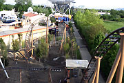 Parkteil mit seinen verschiedenen offenen Stahlachterbahnen fast schon