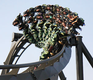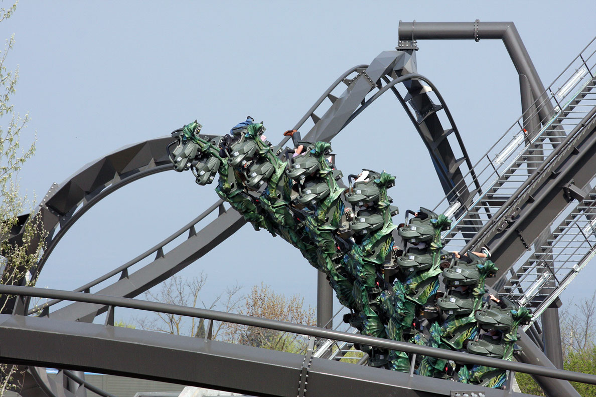 Der ausladende Zug auf dem Lifthügel und in der Zero-G-Roll |